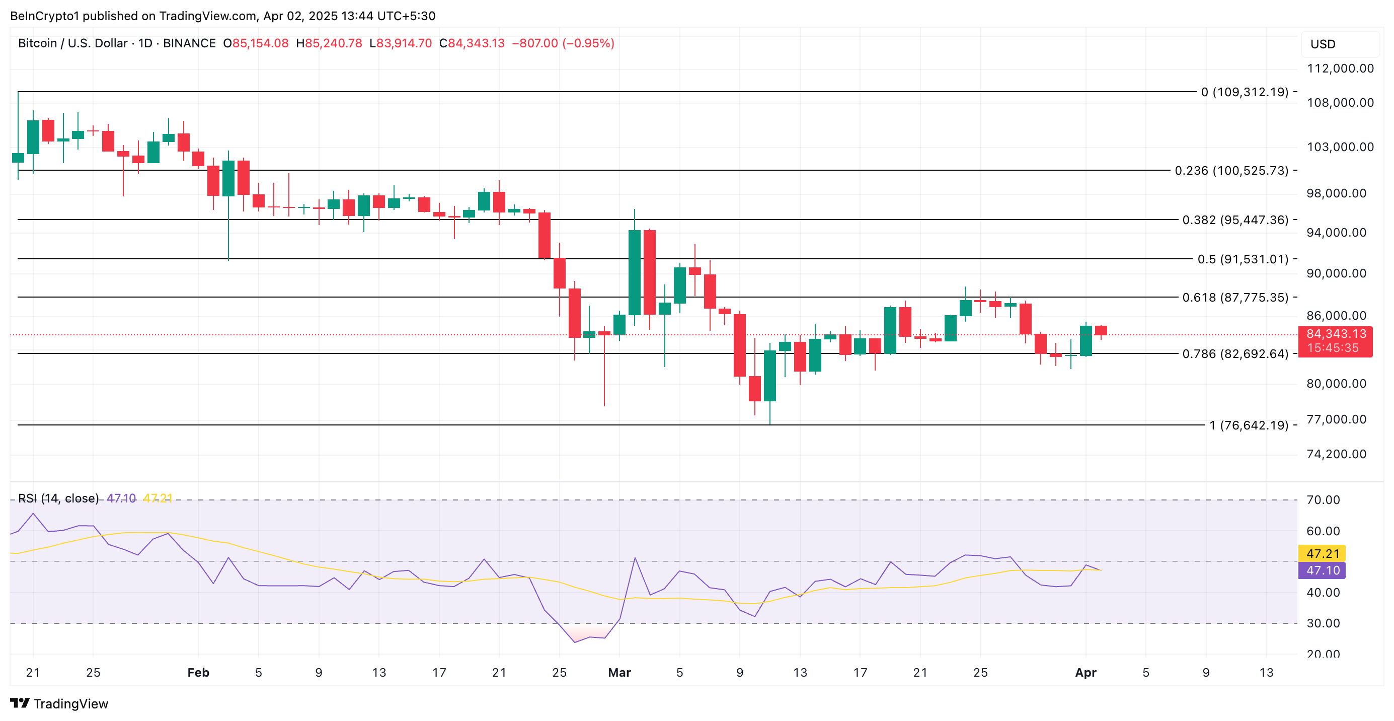 Op de dagelijkse grafiek probeert BTC de neutrale lijn van zijn Relative Strength Index te doorbreken, wat de stijgende koopactiviteit weerspiegelt. Op het moment van schrijven staat deze belangrijke momentumindicator op 47,10.