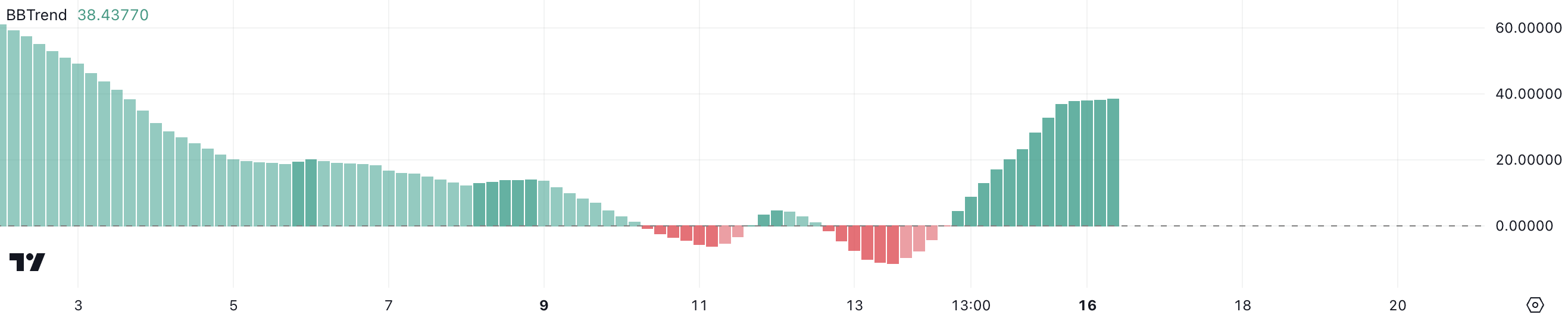 De BBTrend van VIRTUAL staat momenteel op 38,4, een significante stijging van -0,01 op 14 december. Deze scherpe stijging duidt op een sterke verschuiving in momentum, wat sterke bullish activiteit benadrukt.