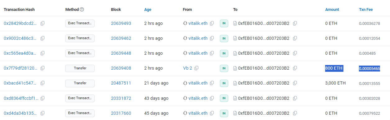 Vitalik Buterin heeft onlangs 800 ETH-tokens, ter waarde van $2,01 miljoen, overgemaakt naar een multisig wallet. Deze transactie trok aandacht, omdat het de tweede keer deze maand was dat hij een dergelijke overdracht deed.