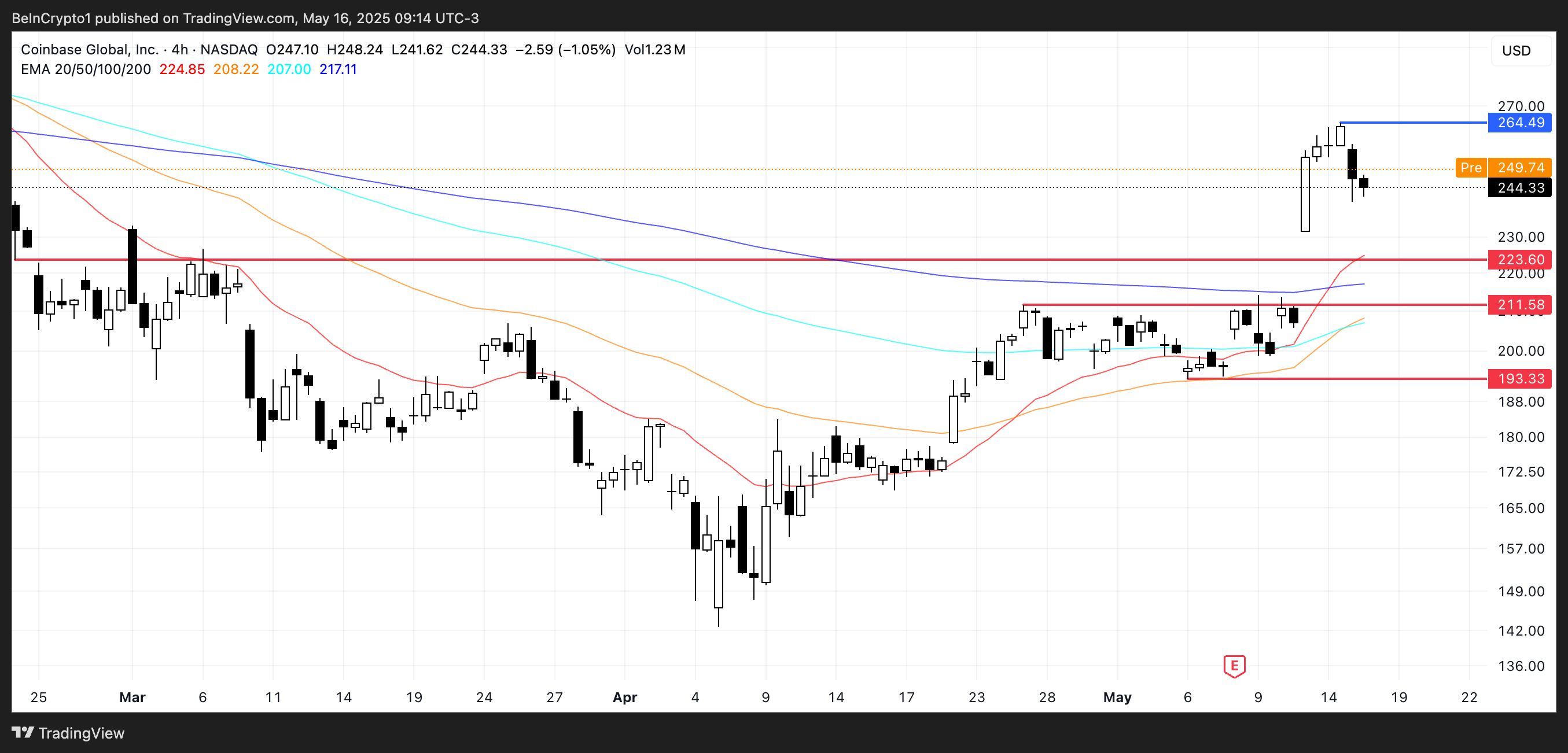 Ondanks dat de aanvallers een losgeld van $20 miljoen eisten, weigerde Coinbase en bood in plaats daarvan hetzelfde bedrag als beloning voor tips over de daders. Technisch gezien blijft COIN weerstand ondervinden rond $265, met bullish EMA-lijnen die nog steeds aanwezig zijn.
