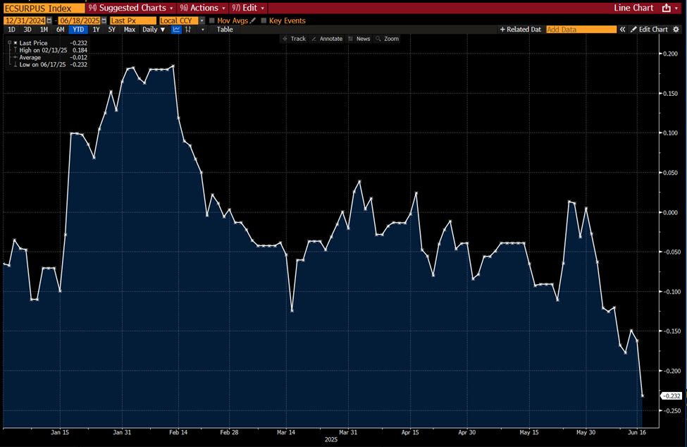 Volgens Lisa Abramowicz, co-host bij Bloomberg Surveillance, is de US Economic Surprise Index dit jaar het meest negatief geworden. Steeds meer economische indicatoren blijken zwakker dan analisten aanvankelijk hadden verwacht.