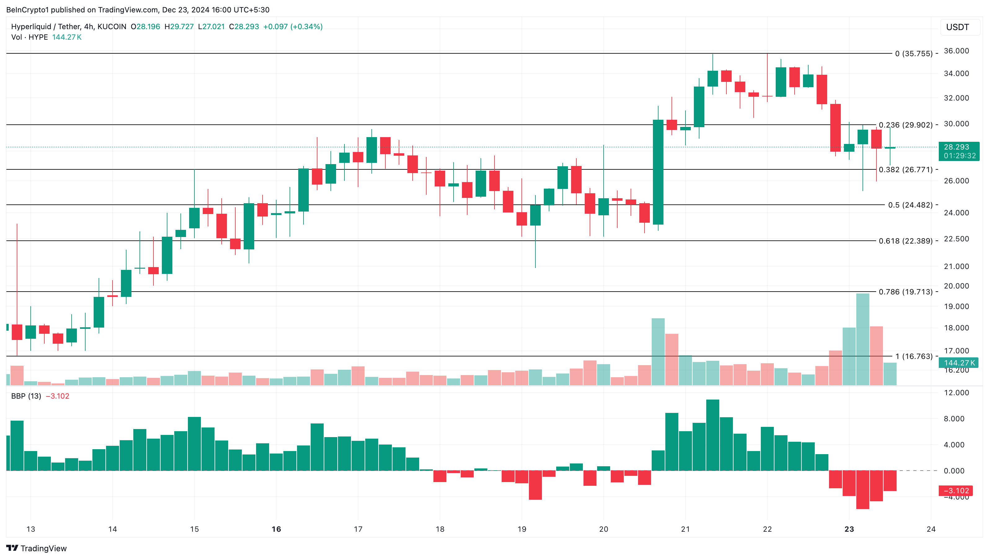 Wanneer de meting positief is, betekent dit dat bulls dominant zijn en de koers kan stijgen. Maar in dit geval is het andersom. Als deze trend niet verandert, kan HYPE’s koers dalen naar $22,39.