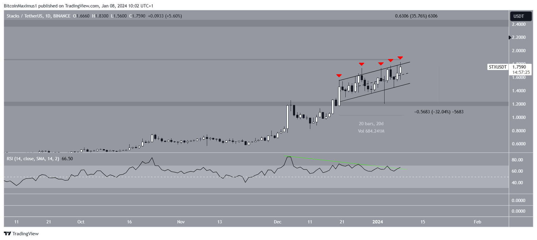 SponsoredTen eerste handelt de Stacks koers al 20 dagen binnen een stijgend parallelkanaal. Deze kanalen bevatten gewoonlijk correctieve bewegingen, wat betekent dat een uitbraak uit het patroon het meest waarschijnlijke scenario zal zijn. Ook heeft de dagelijkse RSI een bearish divergentie gegenereerd (groene lijn).