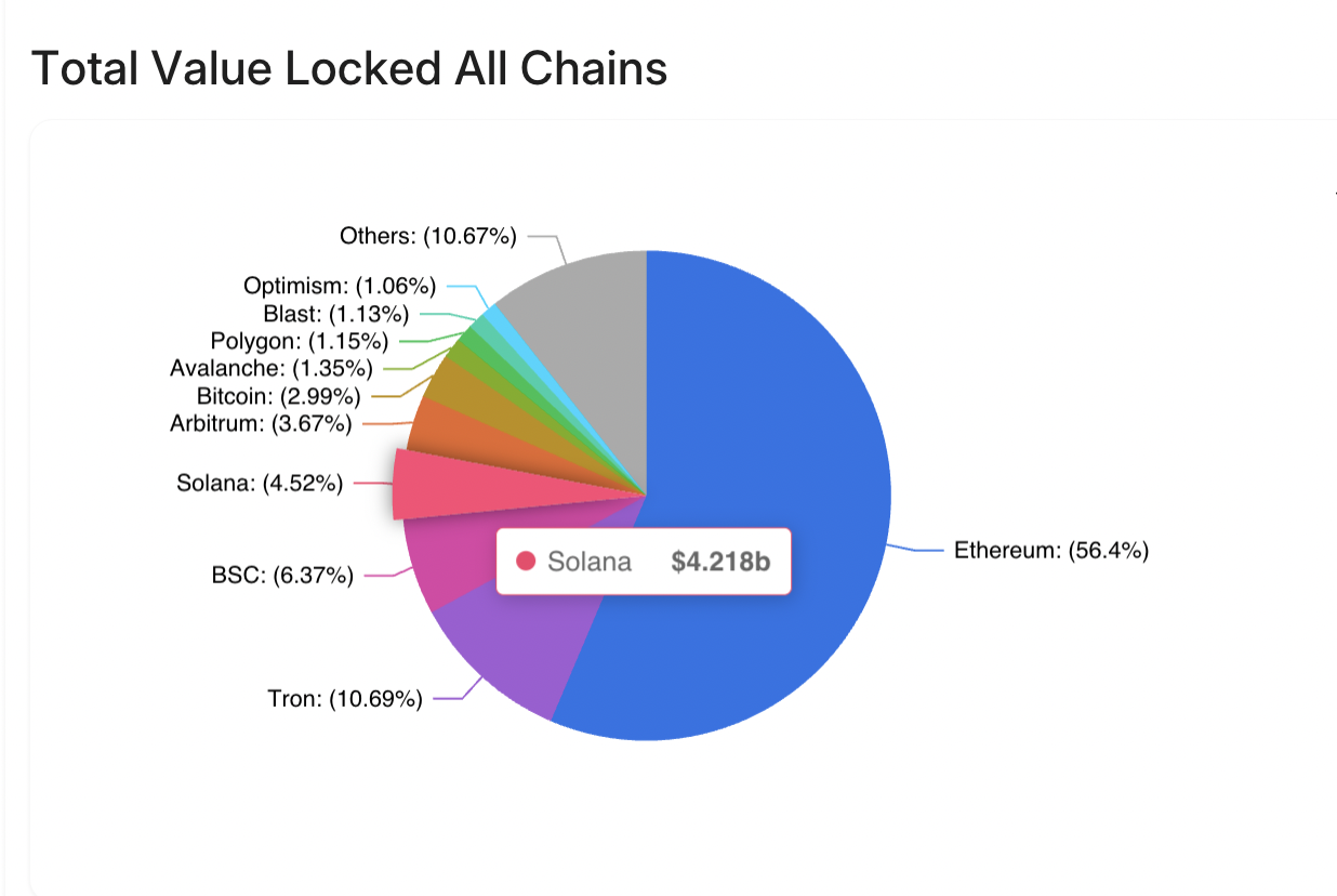 Volgens DeFiLlama heeft het meer dan $4,21 miljard aan total value locked (TVL). Opmerkelijk genoeg vertegenwoordigt dit cijfer een stijging van 127% binnen één maand. Deze stijging plaatst Solana in de voorhoede van de groei van het DeFi-netwerk.