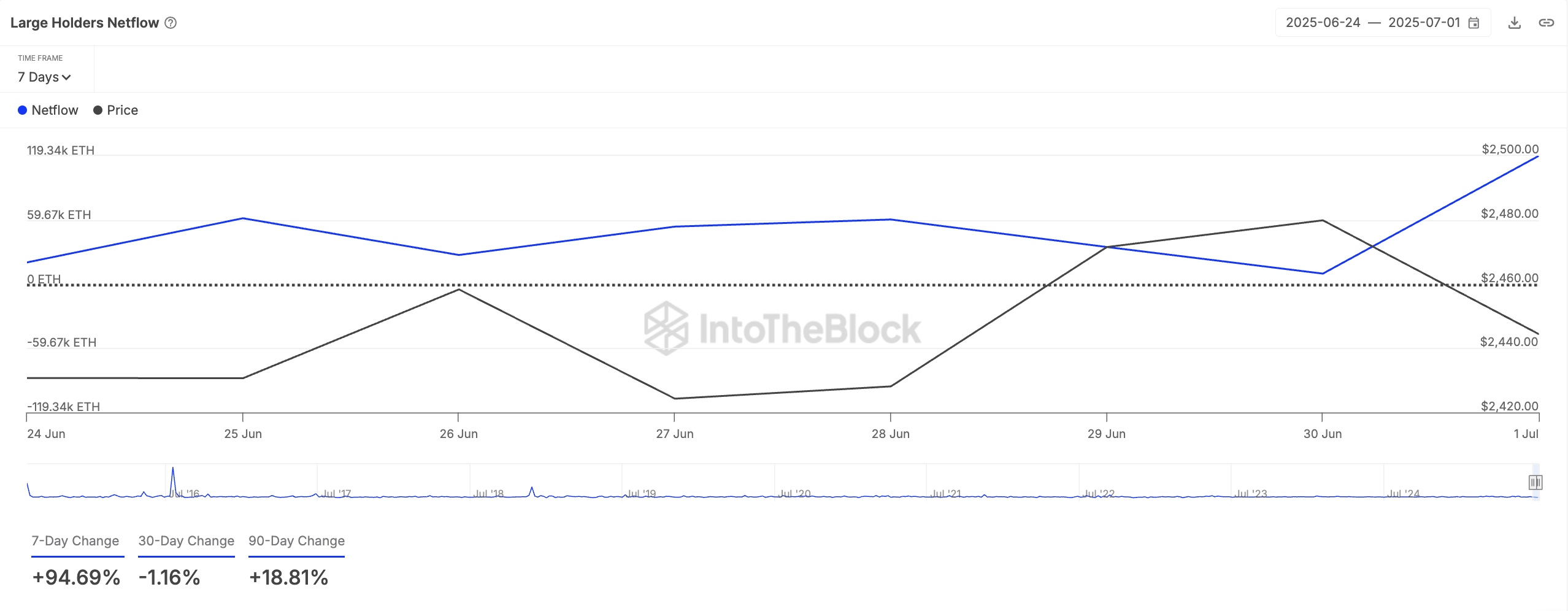 Volgens data van IntoTheBlock is de netto-instroom van grote ETH-houders met 95% gestegen in de afgelopen week, wat wijst op een toegenomen vraag van deze groep investeerders.