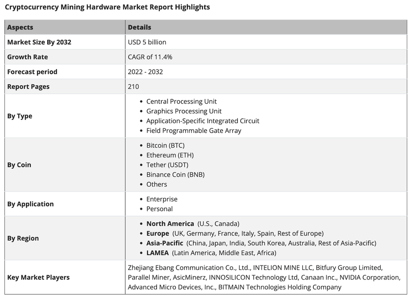 Volgens een rapport van Allied Market Research zal de cryptomijnbouwmarkt tegen 2032 een waarde van $5 miljard bereiken. Het rapport vermeldt dat de huidige waardering van de markt $1,8 miljard bedraagt.