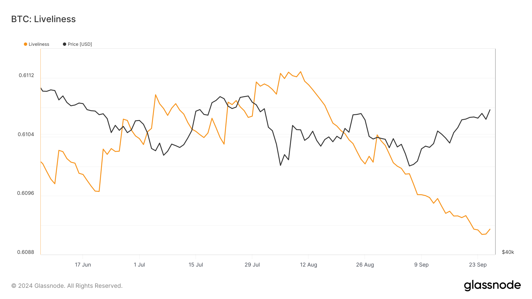 De Liveliness-indicator, die de activiteit van langetermijnhouders volgt, toont een stijging. Dit geeft aan dat LTH’s zijn begonnen met het liquideren van posities, wat kan leiden tot een koerscorrectie. Liveliness stijgt als langetermijnhouders verkopen en daalt wanneer zij HODL.