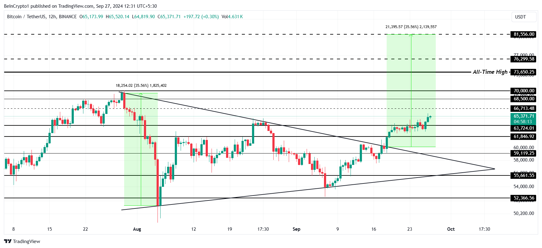 Bitcoin is al uit een bullish symmetrisch driehoekspatroon gebroken, wat suggereert dat de cryptocurrency met maar liefst 35% zou kunnen stijgen, met een potentieel doel van $81.556. Echter, een realistischer vooruitzicht plaatst het volgende doel op $70.000 terwijl BTC momentum blijft opbouwen.