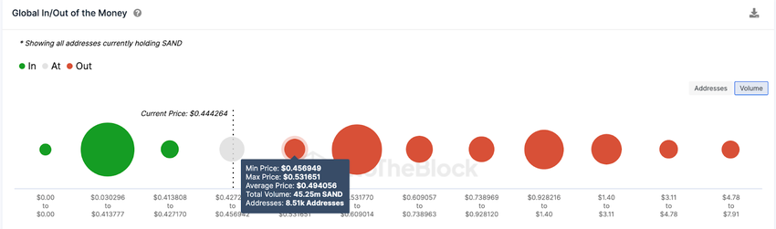 Het laat echter zien dat de bears de initiële weerstand op $0,50 moeten schalen om zeker te zijn van een parabolische breakout. Zoals hieronder te zien is, kochten 8.510 holders 45,25 miljoen SAND tegen de gemiddelde koers van $ 0,49. Als deze investeerders vroeg uitstappen, zouden ze een koerscorrectie voor SAND kunnen veroorzaken.
