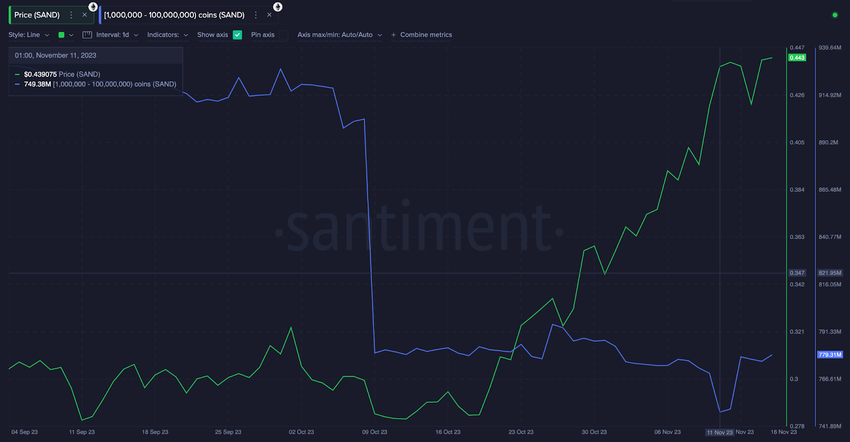 Tussen 11 en 16 november hebben crypto whales (wallets met 100.000 tot 1 miljard SAND) maar liefst 30 miljoen SAND tokens gekocht. Deze koopwoede bracht de cumulatieve saldi van de whales van 749 miljoen naar 779,30 miljoen binnen een week na de samenwerking tussen Gucci en The Sandbox.