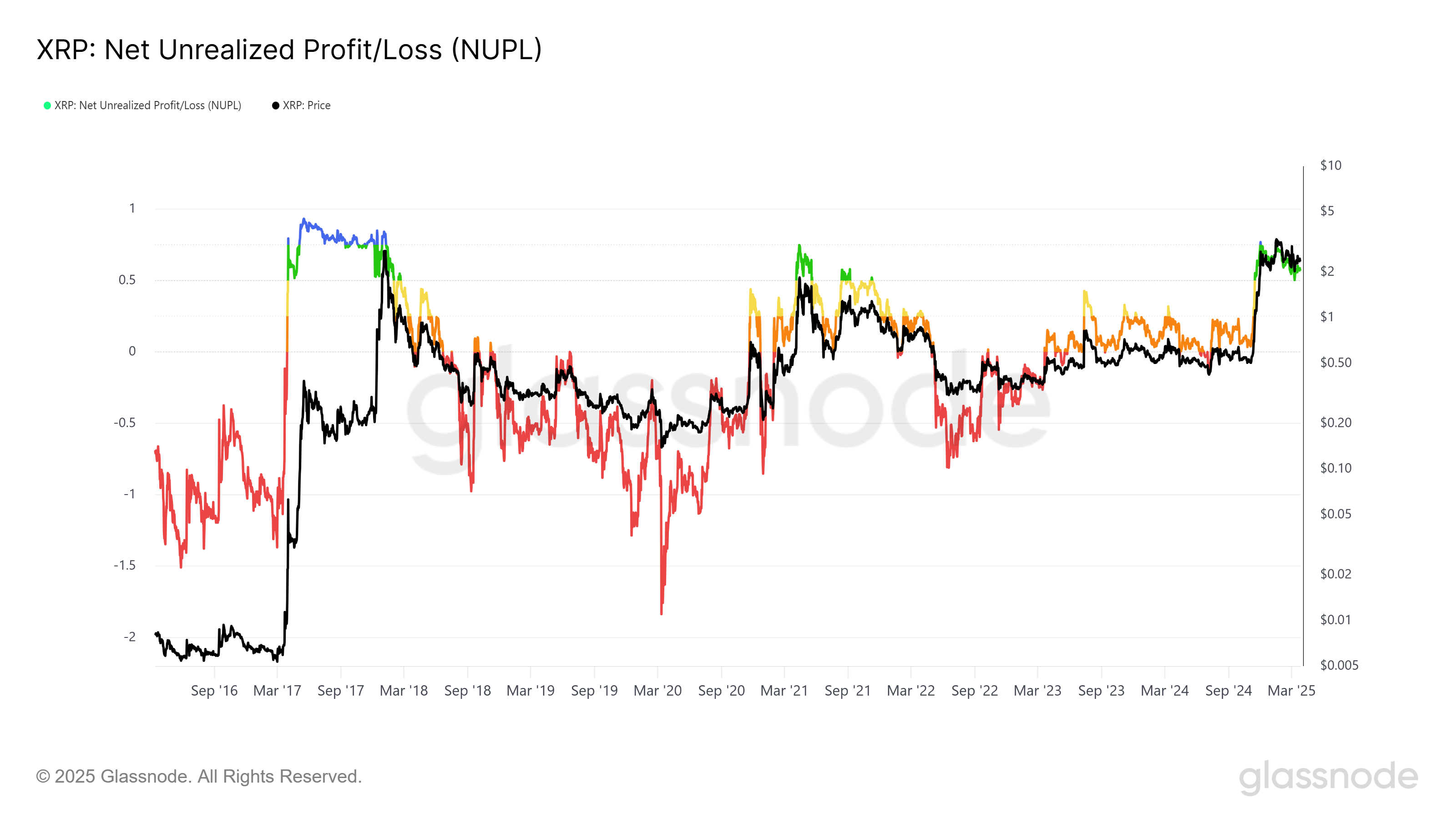 XRP’s Network Utilization en Profit/Loss (NUPL) indicator tonen aan dat de altcoin momenteel verzadigd is. Dit suggereert dat er weinig vooruitgang is in termen van koersbeweging, en XRP heeft sterke marktsignalen nodig om een duidelijke richting te kiezen. Historisch gezien heeft XRP vergelijkbare consolidatiefasen doorgemaakt.