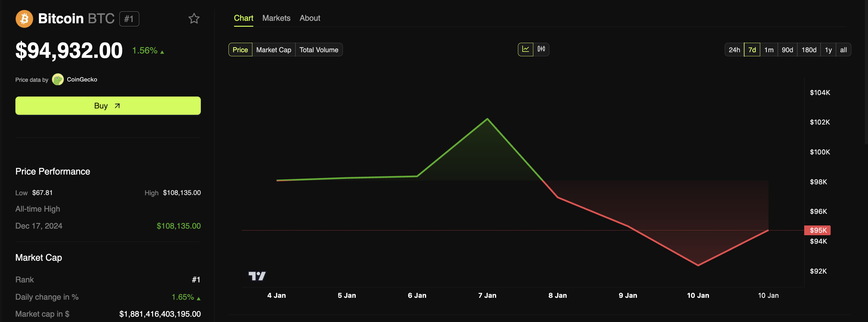 Desondanks daalde de Bitcoin koers de afgelopen week van een piek van $102.000 naar een low van $92.000. Op het moment van schrijven werd BTC verhandeld op $94.932 na een lichte herstel.