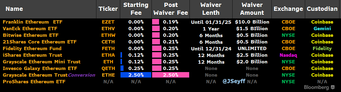 De ETF-emittenten hebben ook de details van de vergoedingen vrijgegeven. De vergoedingen voor de meeste ETF’s variëren tussen 0,19% en 0,25%. Grayscale Ethereum Trust heeft echter de hoogste vergoeding, namelijk 2,5%.