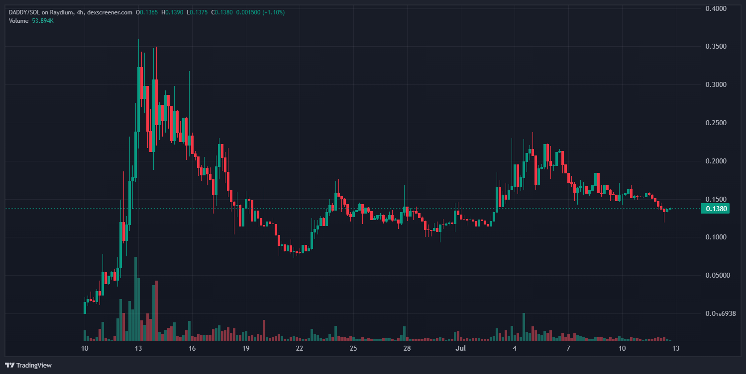 Deze week waren er ook ontwikkelingen in de celebrity meme coins. Daddy Tate (DADDY), een op Solana gebaseerde meme coin die gerelateerd is aan de controversiële influencer Andrew Tate, bereikte meer dan 55.000 holders. Data van DEX Screener laat zien dat DADDY momenteel wordt verhandeld op $0,1380, met een marktkapitalisatie van $82,7 miljoen.