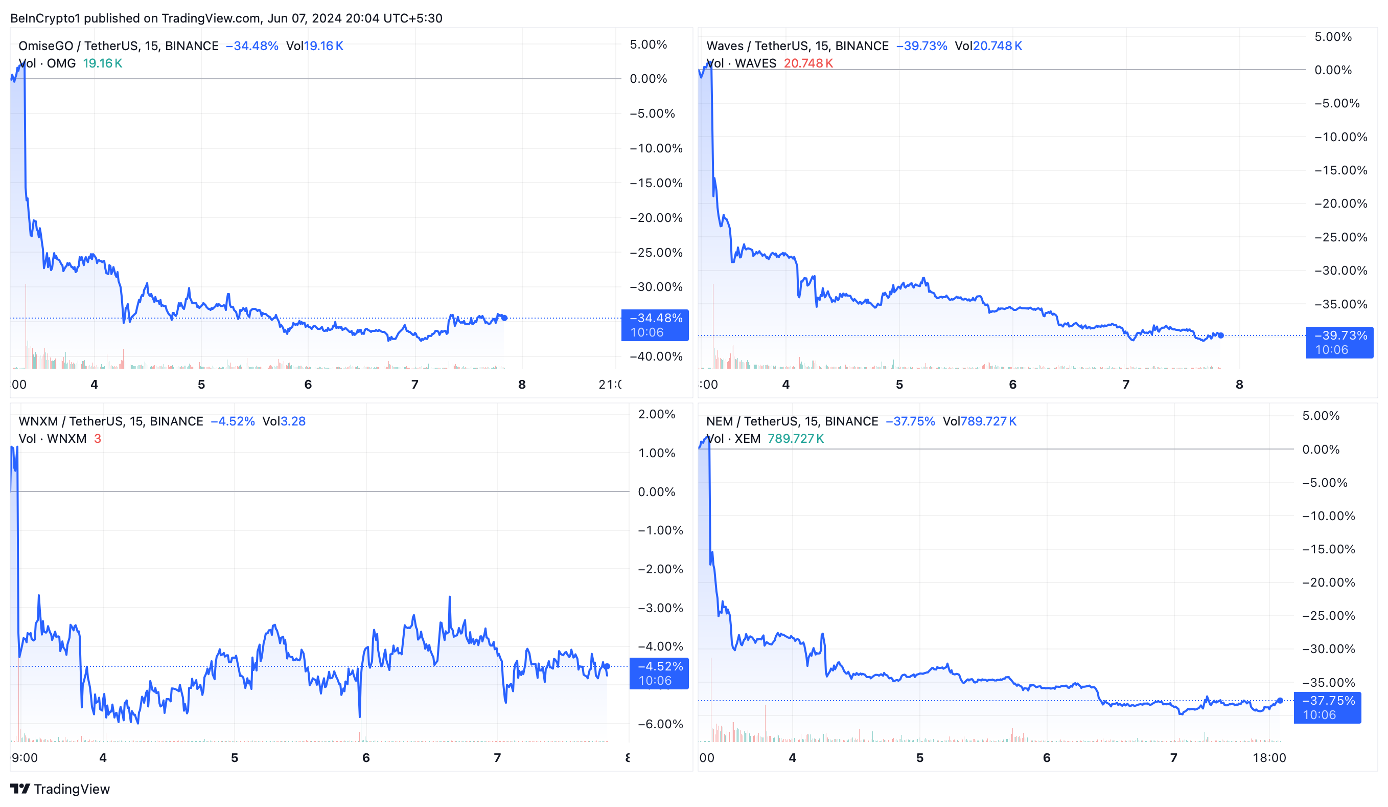Als gevolg hiervan zijn de koersen van deze coins sterk gedaald, waarbij OMG, WAVES en XEM sterke dalingen hebben doorgemaakt, terwijl WNXM slechts een lichte daling heeft doorgemaakt.