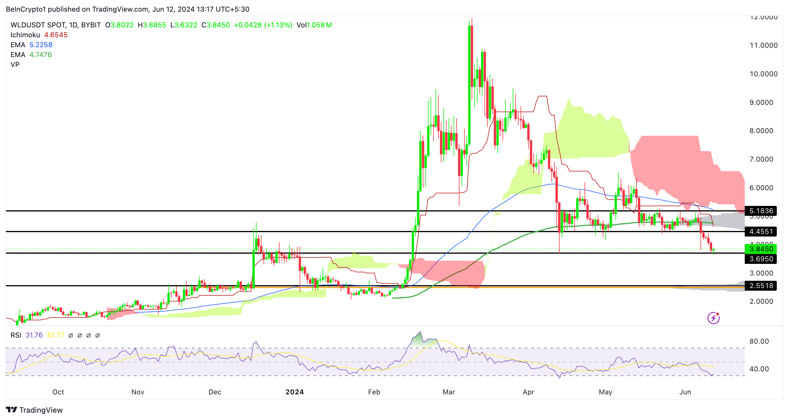 De Worldcoin (WLD) koers slaagde er niet in de Ichimoku-cloud te betreden, wat duidt op een sterke weerstand op $5.