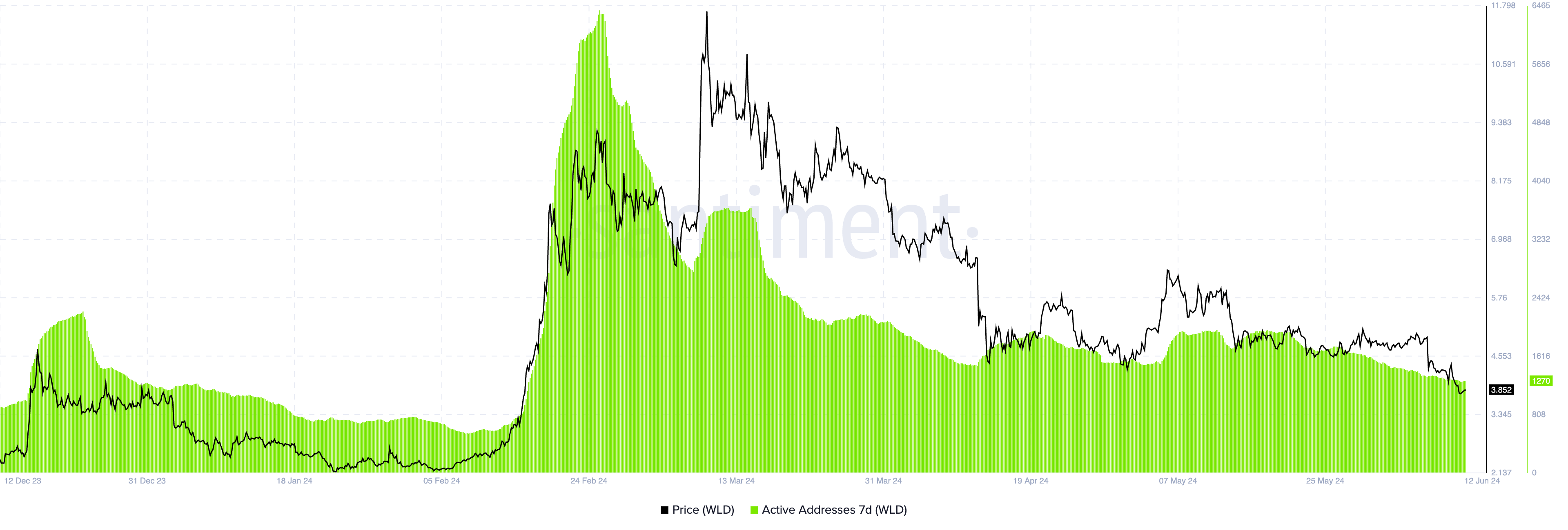 Van 12 mei tot 12 juni 2024 kelderde de koers van Worldcoin met 34%. Dit onderstreept een periode van sterke neerwaartse druk. Het aantal actieve adressen daalde met ongeveer 35,1% en viel terug tot het niveau van midden februari 2024.