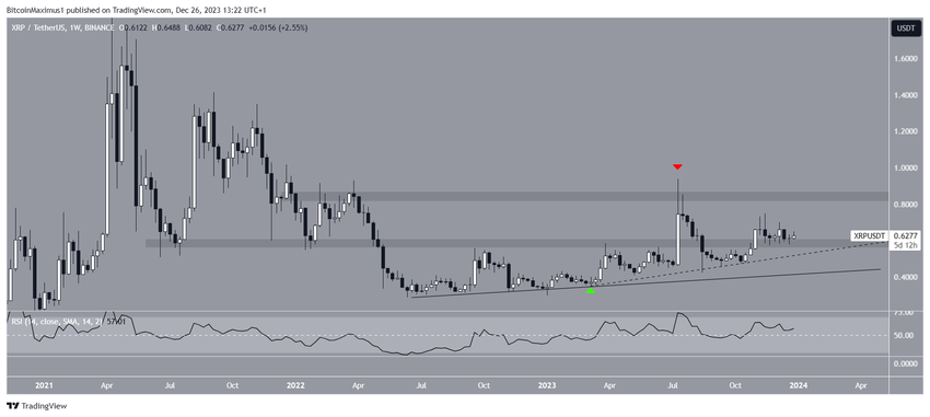 De technische analyse op weekbasis laat zien dat XRP sinds mei 2022 is gestegen naast een stijgende ondersteuningstrendlijn.