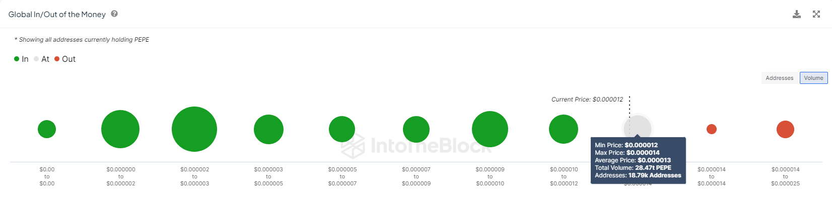 Volgens de Global In/Out of the Money (GIOM)-indicator, werd er ongeveer 28,47 biljoen PEPE ter waarde van meer dan $350 miljoen gekocht tussen $0,00001200 en $0,00001400. Dit aanbod zal winstgevend worden zodra PEPE boven deze koers sluit, wat ook het volgende weerstandniveau voor de meme coin is.