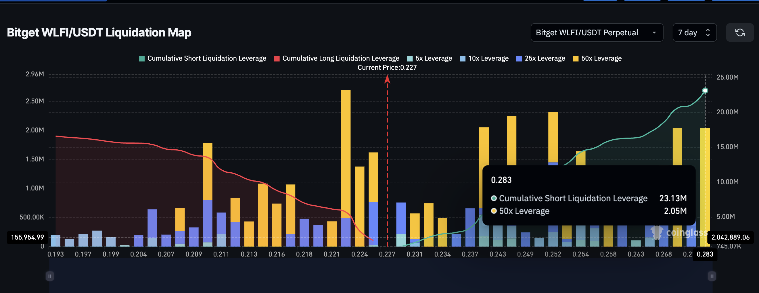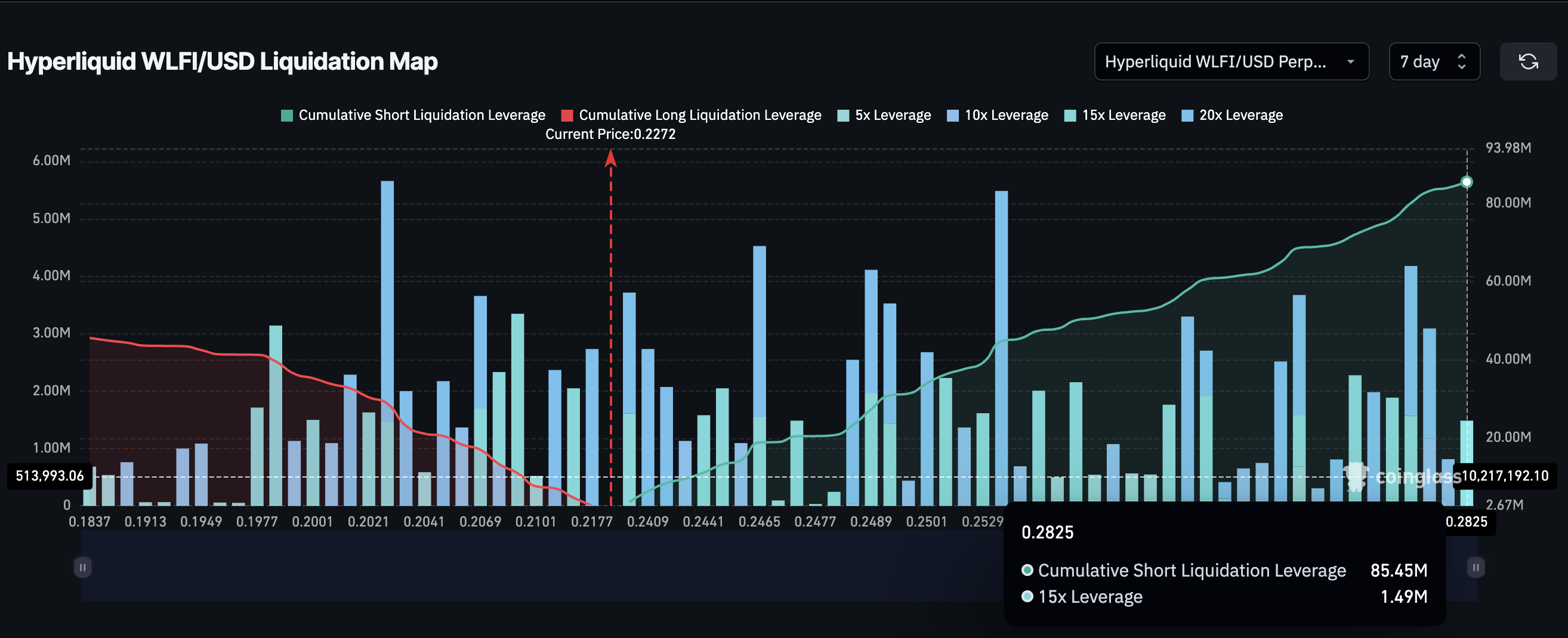 Deze onbalans schept de basis voor een mogelijke short squeeze — waarbij stijgende prijzen shorts dwingen hun posities te dekken, wat de rally versnelt. Als WLFI boven $0,28 uitkomt, kunnen de liquidatieclusters snel worden afgewikkeld en de koers richting $0,32 duwen, het vorige swing high.
