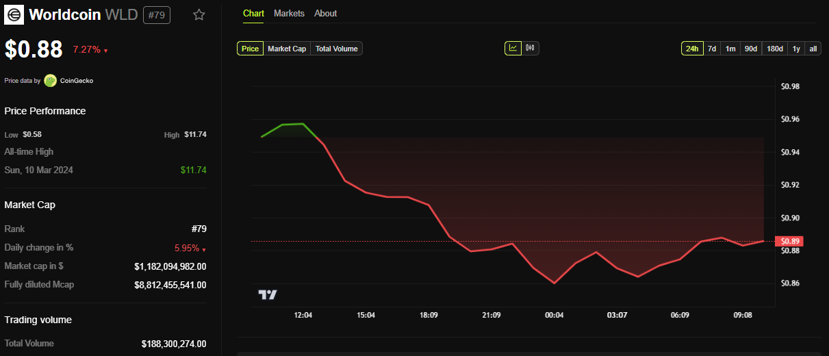 Deze juridische ontwikkelingen hadden een snel effect op het investeerderssentiment. De native token van Worldcoin (WLD) daalde bijna 10% in de afgelopen 24 uur. Volgens BeInCrypto koersgegevens werd WLD verhandeld op $0,88 op het moment van schrijven.