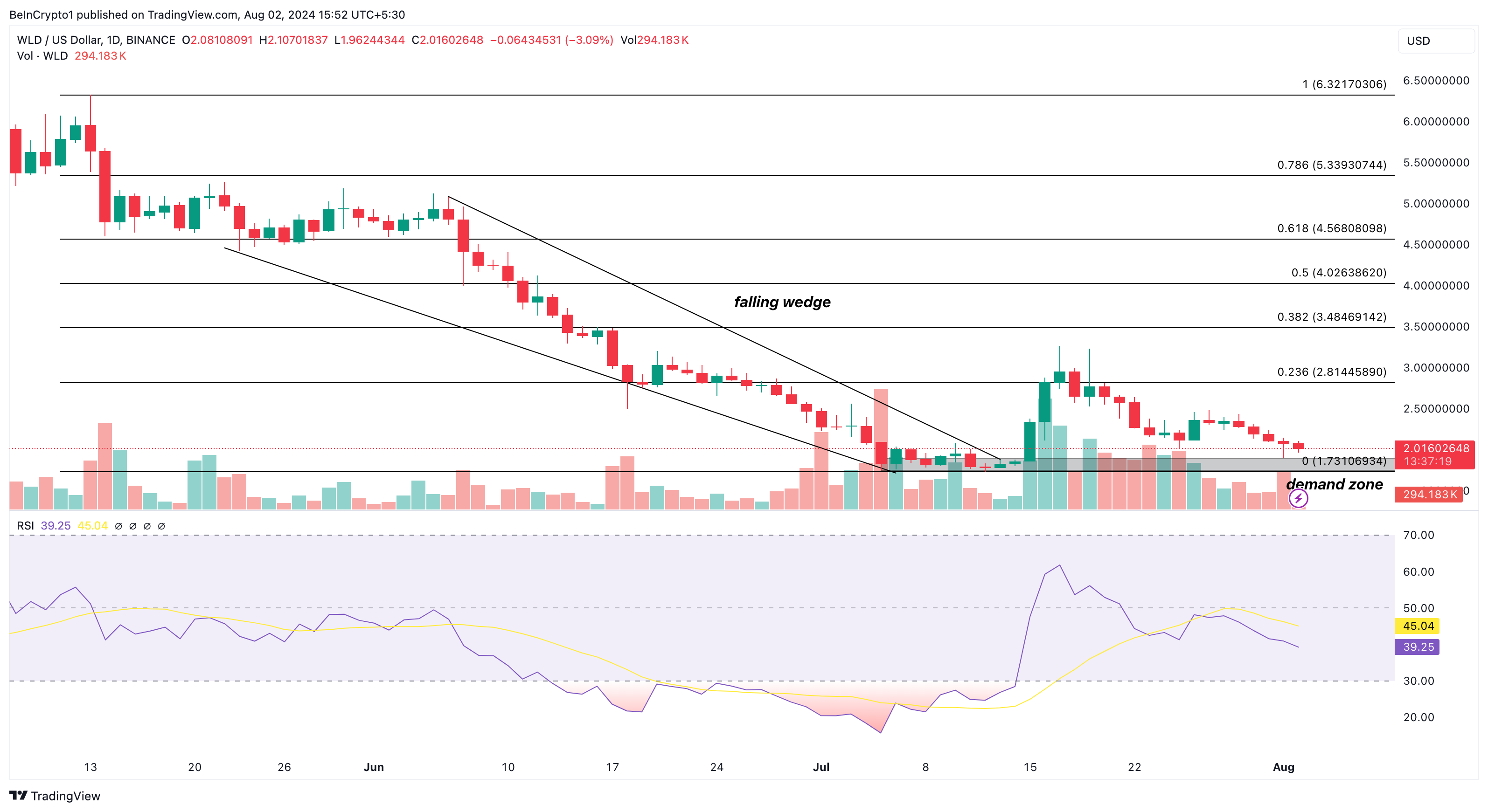 Op 13 juli brak WLD uit een dalende wig op de dagelijkse grafiek. Een dalende wig is een bullish patroon dat een situatie weerspiegelt waar verkopers momentum verliezen en kopers profiteren van de vermoeidheid om de koers te laten stijgen.