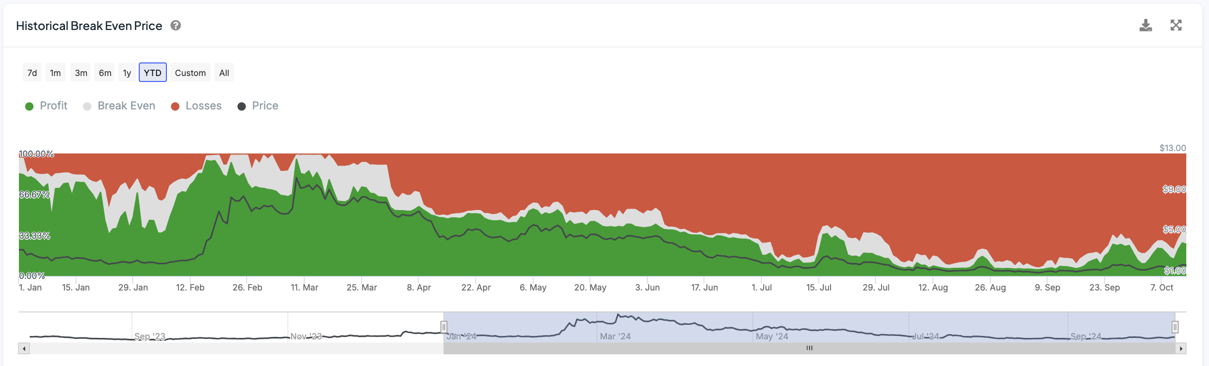 De grafiek van de historische break-evenprijs biedt waardevolle inzichten hierover, door te tonen waar de meeste houders hebben gekocht en aan te geven of ze winst maken, break-even draaien of verlies lijden. Op dit moment is slechts 25% van de houders winstgevend, terwijl ongeveer 10% break-even draait, waardoor een aanzienlijk deel nog steeds in het rood staat