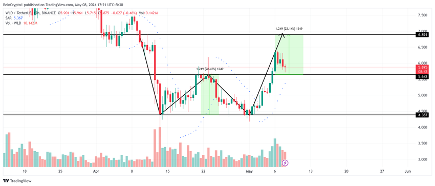 De koers van Worldcoin wordt op het moment van schrijven verhandeld op $5,8 na het doorbreken van de neklijn van het dubbele bodempatroon waarin het zich bevindt.