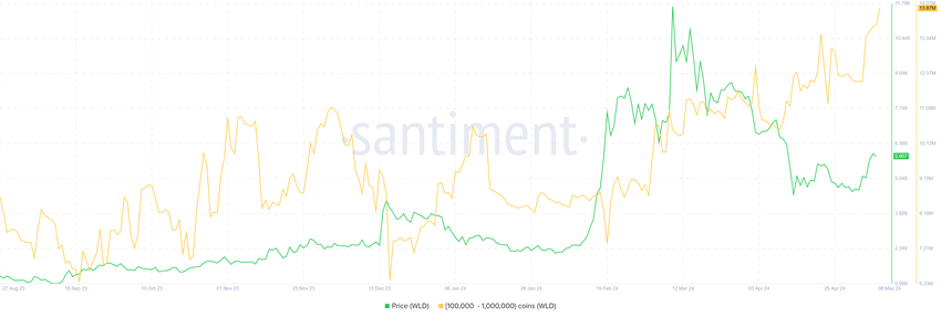 Dit komt omdat, ondanks de correctie, WLD holders bullish bleven in hun gedrag. Whale-adressen in het bijzonder bleven niet alleen accumuleren, maar versnelden zelfs hun tempo. In een week tijd voegden adressen met tussen 100.000 en 1 miljoen WLD meer dan 2 miljoen WLD toe.