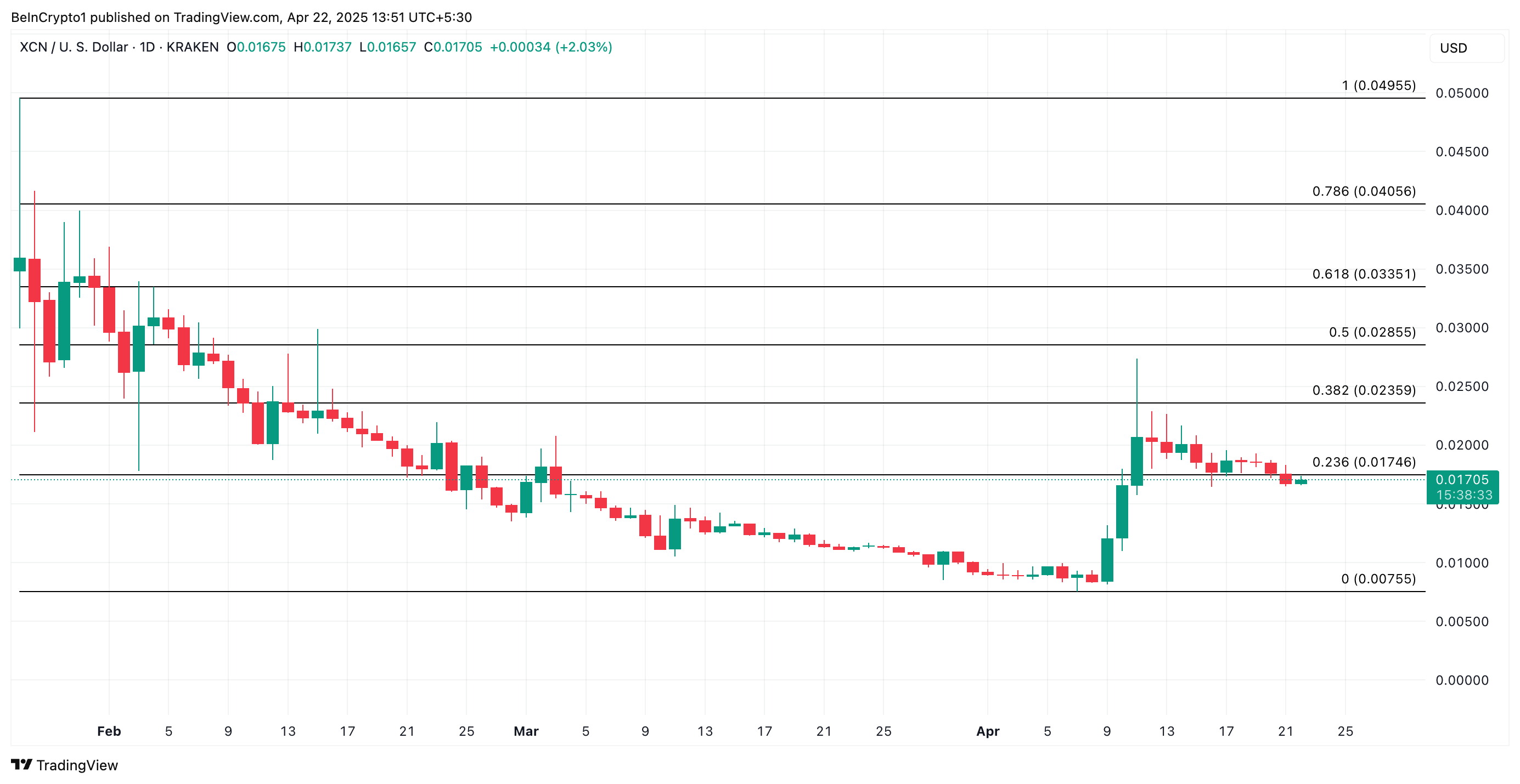Als de daling doorgaat, kan de koers van XCN dalen naar $0,0075.