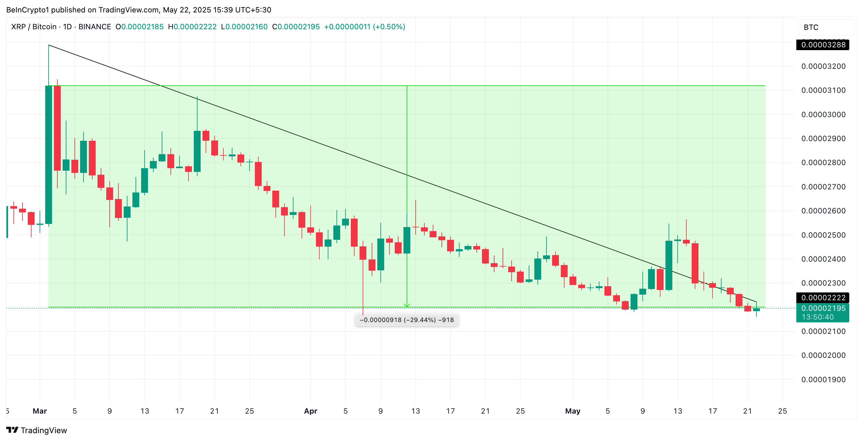 Op het moment van schrijven staat het XRP/BTC-handelspaar op 0,000021 BTC, een daling van 29% sinds het begon met zijn neerwaartse trend op 2 maart.