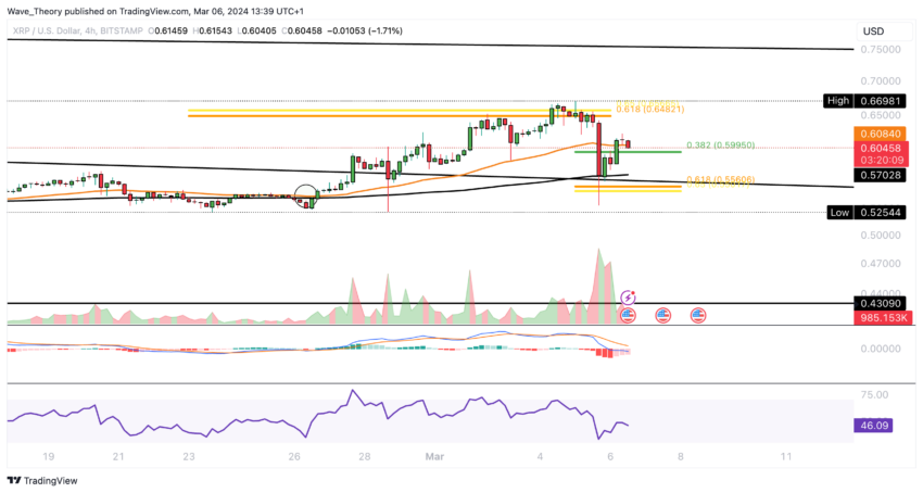 Een paar dagen geleden naderde de XRP koers de cruciale gouden ratio weerstand op $0,65, maar het kreeg te maken met een bearish afwijzing na verschillende mislukte pogingen om er doorheen te breken. Bijgevolg trok XRP zich terug en vond steun nabij de gouden ratio op $0,55, vanwaar het een bullish rebound zag.
