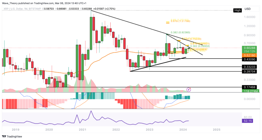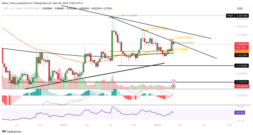 Omgekeerd, als XRP zich terugtrekt, zou het steun kunnen vinden in de buurt van de gouden ratio op $0,54, waar ook de 50-weeks EMA ligt.