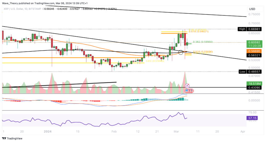 Als gevolg hiervan zou XRP zich kunnen terugtrekken om steun te vinden nabij de gouden ratio op $0,55, tenzij het met succes de gouden ratio weerstand op $0,65 weet te overwinnen om de correctie te beëindigen.
