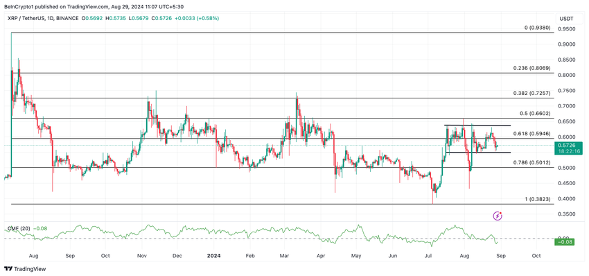 Momenteel handelt XRP op $0,57 en beweegt sinds 17 juli binnen een horizontaal kanaal. Wanneer de koers van een activum binnen een specifiek bereik fluctueert, creëert het een kanaal dat een evenwicht weerspiegelt tussen koop- en verkoopdrukken, waardoor de koers wordt verhinderd een sterke beweging in een van beide richtingen te maken.