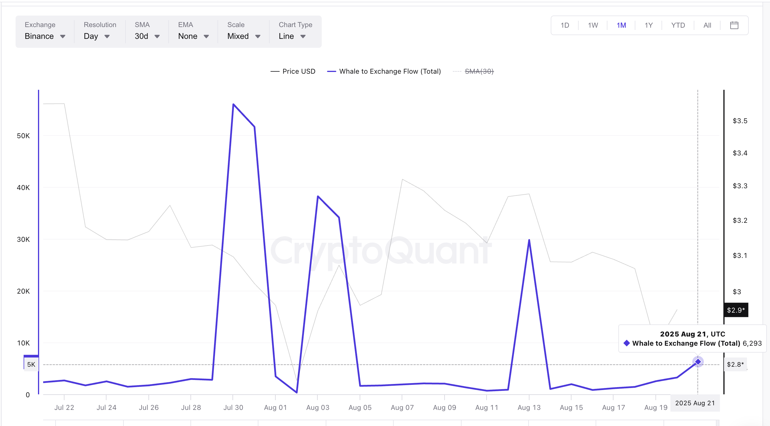Whale-instromen naar Binance zijn weer begonnen te stijgen na laag te zijn gebleven sinds 13 augustus. Op die datum piekten de instromen op ongeveer 29.805 XRP, en de XRP koers daalde kort daarna van $3,27 naar $3,08.