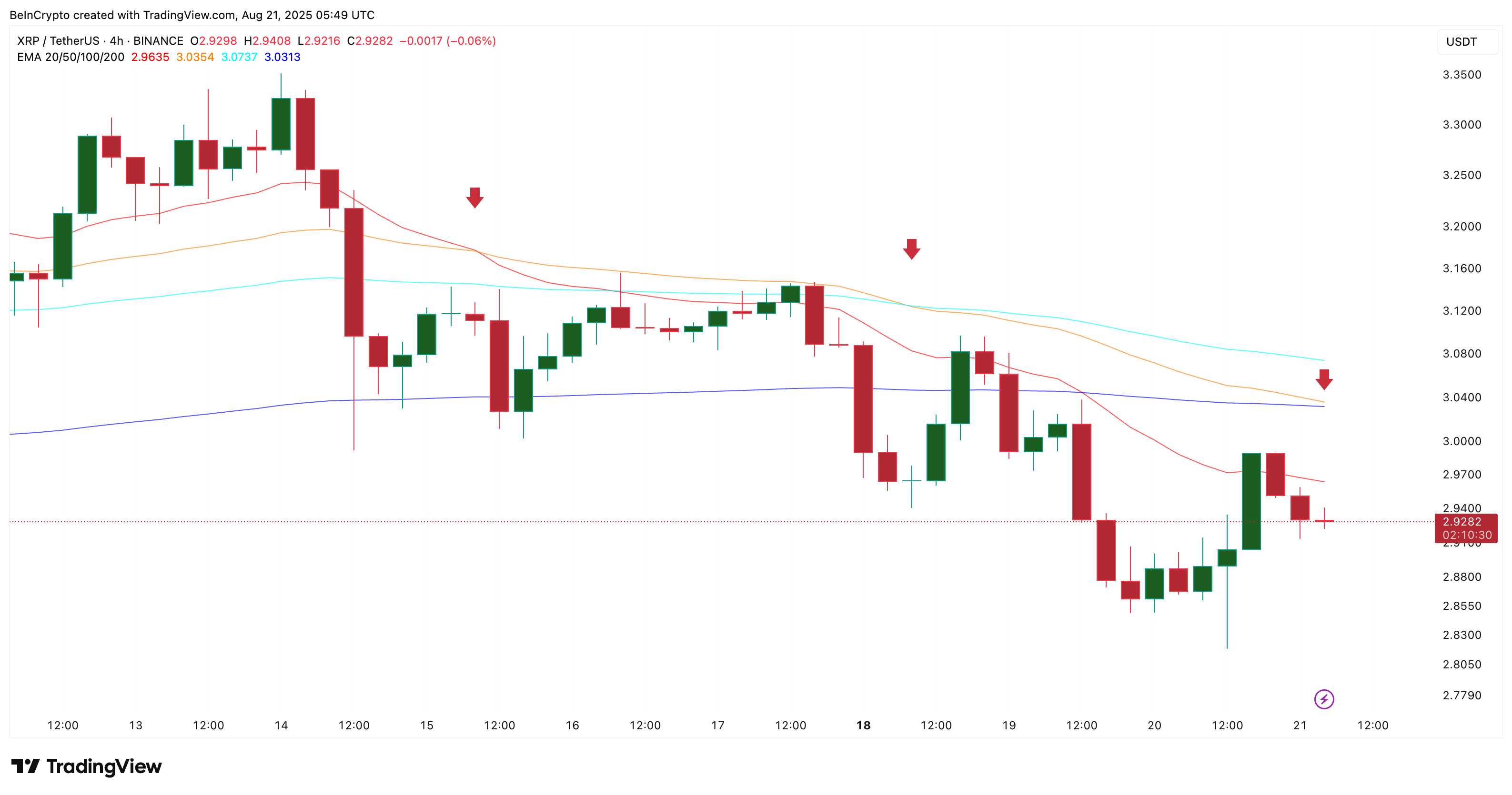 De 4-uur grafiek voor de XRP koers toont dat bearish momentum snel toeneemt. Twee EMA (Exponential Moving Average) death crossovers zijn al gemarkeerd op de grafiek (rode pijlen), en een derde is nu in ontwikkeling. Een death crossover gebeurt wanneer een korte-termijn moving average een lange-termijn moving average kruist, wat vaak een verandering in trendrichting aangeeft.