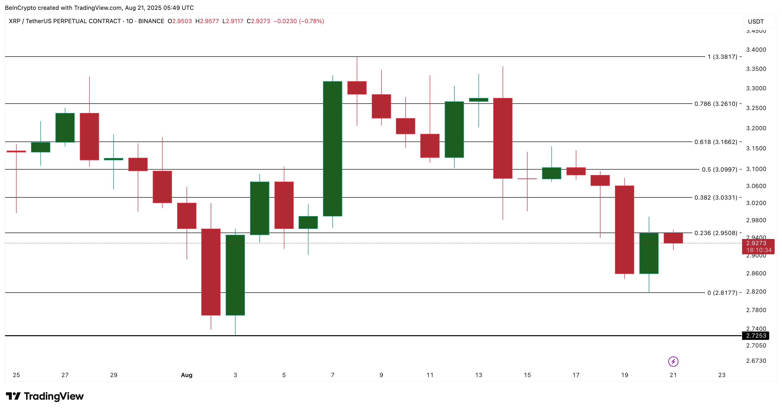 De dagelijkse grafiek laat zien dat XRP blijft worstelen nabij de $2,95 Fibonacci-weerstand. XRP testte dit niveau kort opnieuw, maar slaagde er niet in het om te zetten in steun.