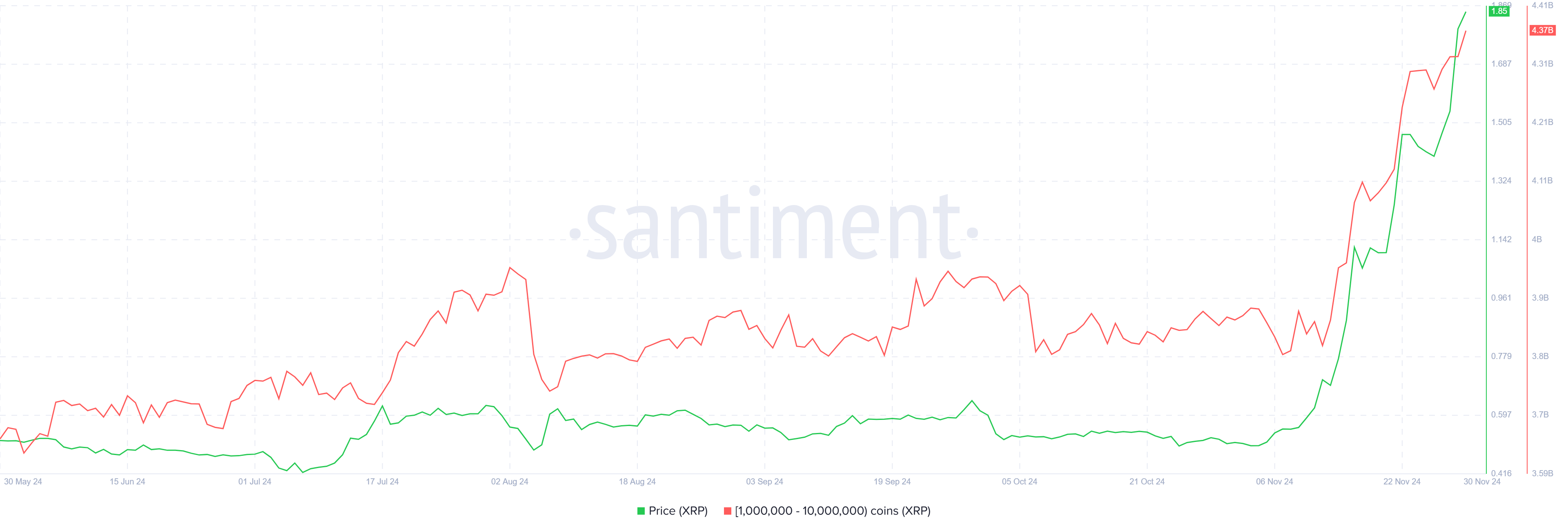 De afgelopen twee weken is de whale-activiteit in de XRP-markt opmerkelijk geweest. Houders van tussen de 1 miljoen en 10 miljoen XRP hebben meer dan $1,12 miljard aan coins verzameld.