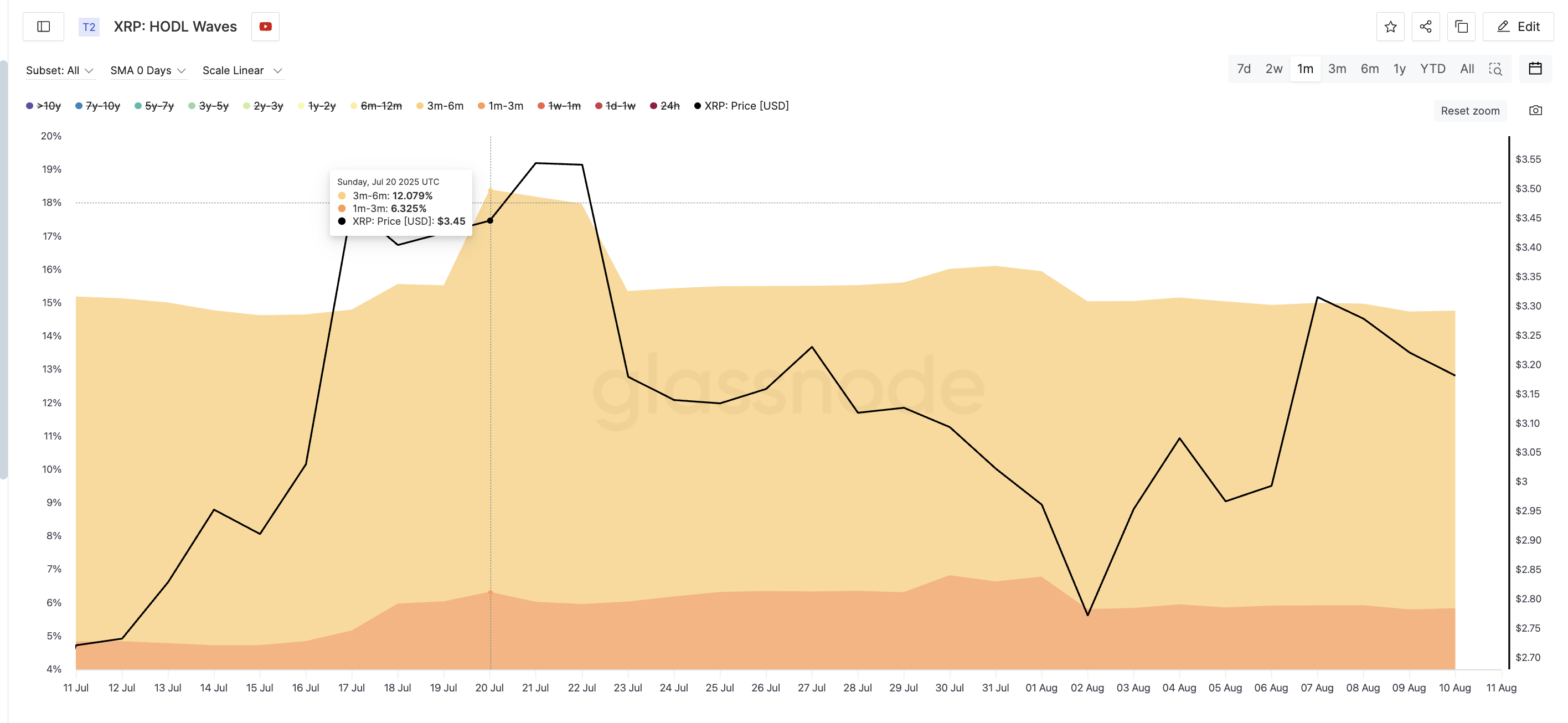 Op 20 juli hadden wallets die XRP voor 3–6 maanden vasthielden ongeveer 12,07% van de totale voorraad. Op 10 augustus was dit percentage gedaald naar 8,93%. De groep wallets die XRP voor 1–3 maanden vasthielden vertoont hetzelfde patroon, met een daling van 6,78% op 1 augustus naar 5,83% op dit moment.