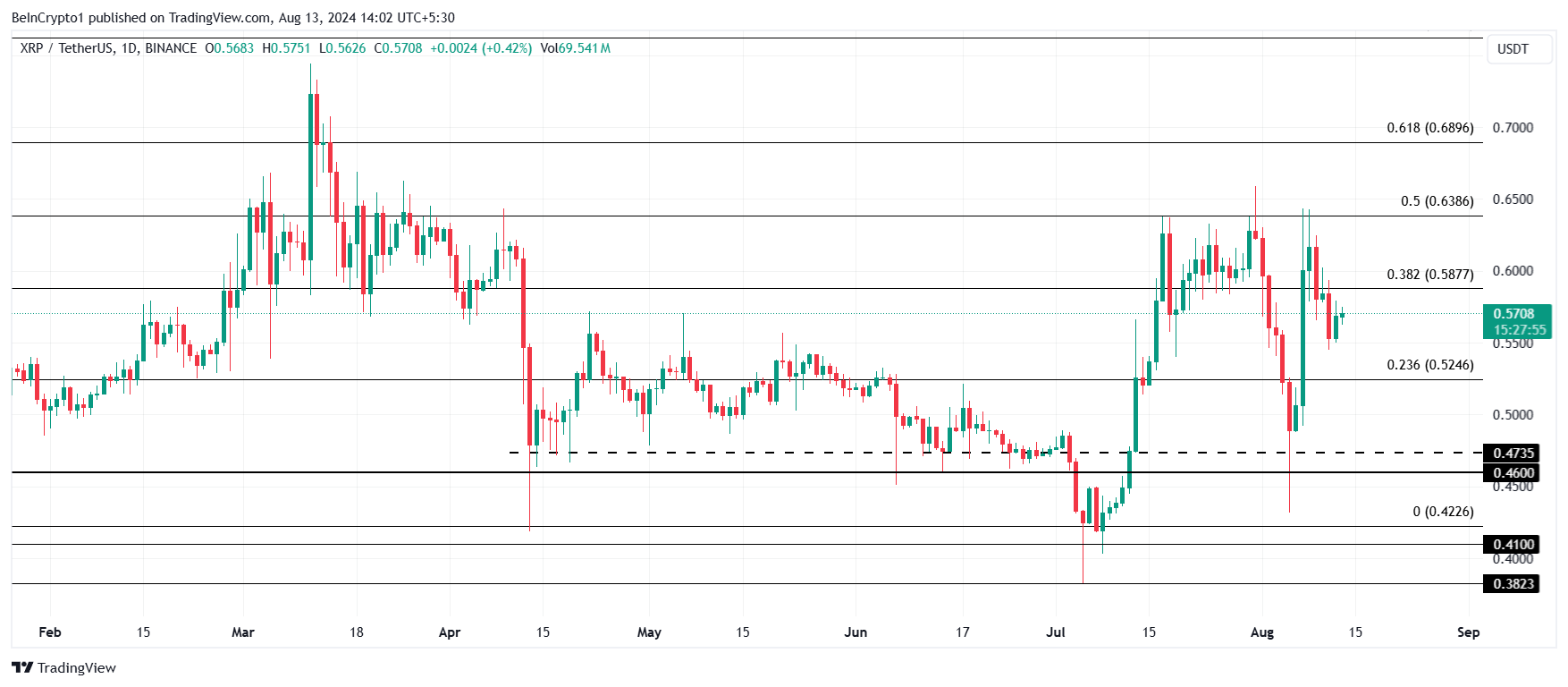 Als de eerder genoemde bearish signalen de koers verder beïnvloeden, zou het niet verrassend zijn om te zien dat de token verder daalt. Dit zou de XRP koers van $0,57 op het moment van schrijven kunnen duwen om de steun op $0,52 te testen, samen met de 23,5% Fib lijn.