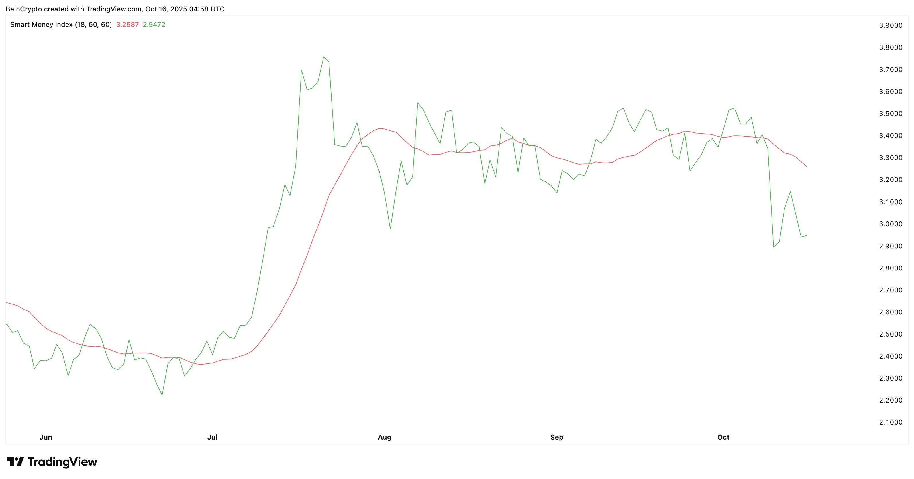 Twee extra metrieken ondersteunen dit. De Smart Money Index (SMI), die bijhoudt hoe ervaren handelaren zich positioneren, is gedaald naar het op een na laagste niveau sinds begin oktober. Dit toont aan dat het vertrouwen in een opleving afneemt.