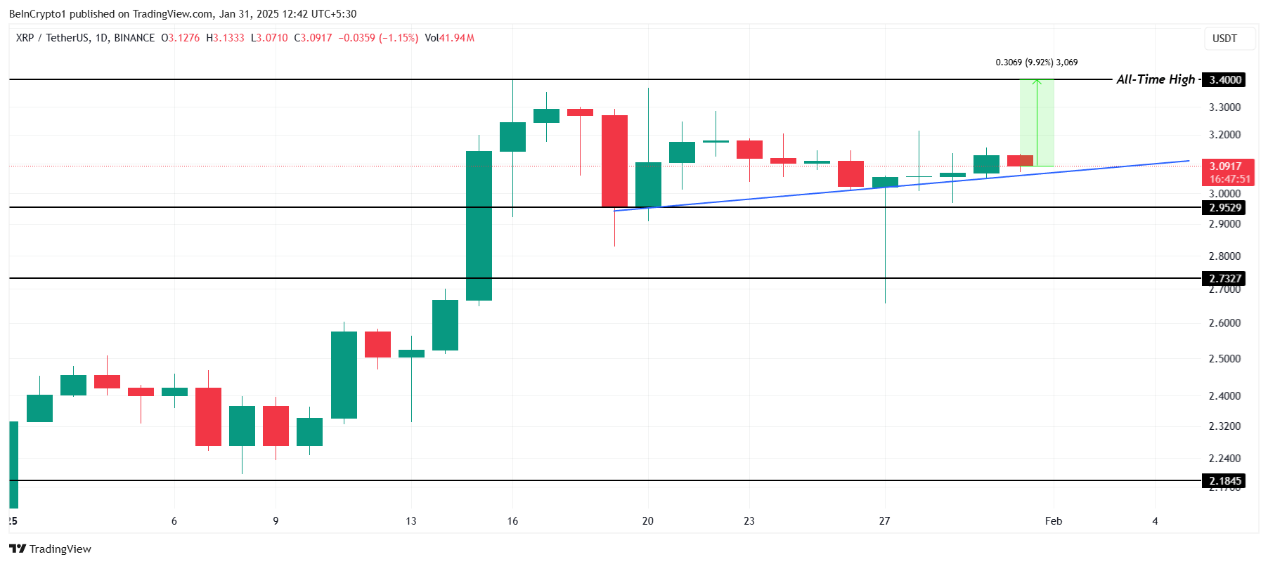 XRP ervaart momenteel een micro opwaartse trend na een herstel vanaf het $2,95 steunniveau. Hoewel de altcoin kort onder dit niveau viel tijdens een intra-day low, herstelde het snel en bleef boven de trendlijn. Dit versterkte het bullish momentum.