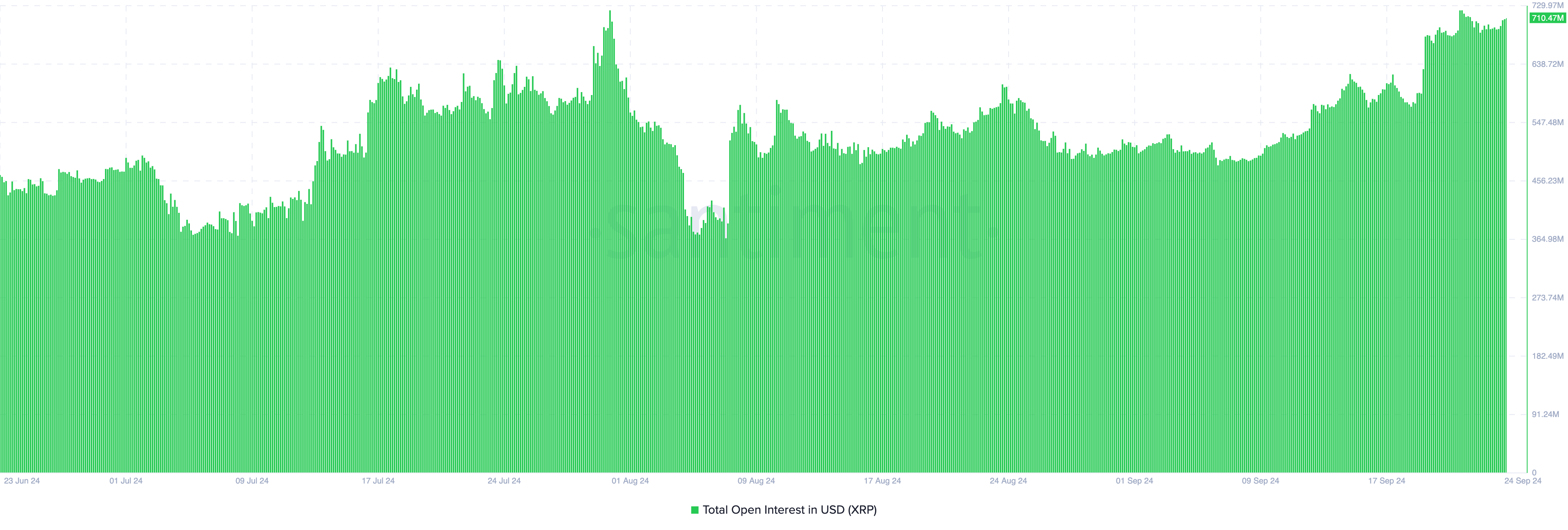 Een daling van de Open Interest (OI) wijst daarentegen op een afname van nettoposities, waarbij liquiditeit uit de markt wordt gehaald. Volgens gegevens van Santiment is de OI van XRP gestegen naar $710 miljoen. Deze toename suggereert dat de XRP koers mogelijk enkele van zijn recente verliezen kan herstellen, doordat meer handelaren actief worden op de markt.