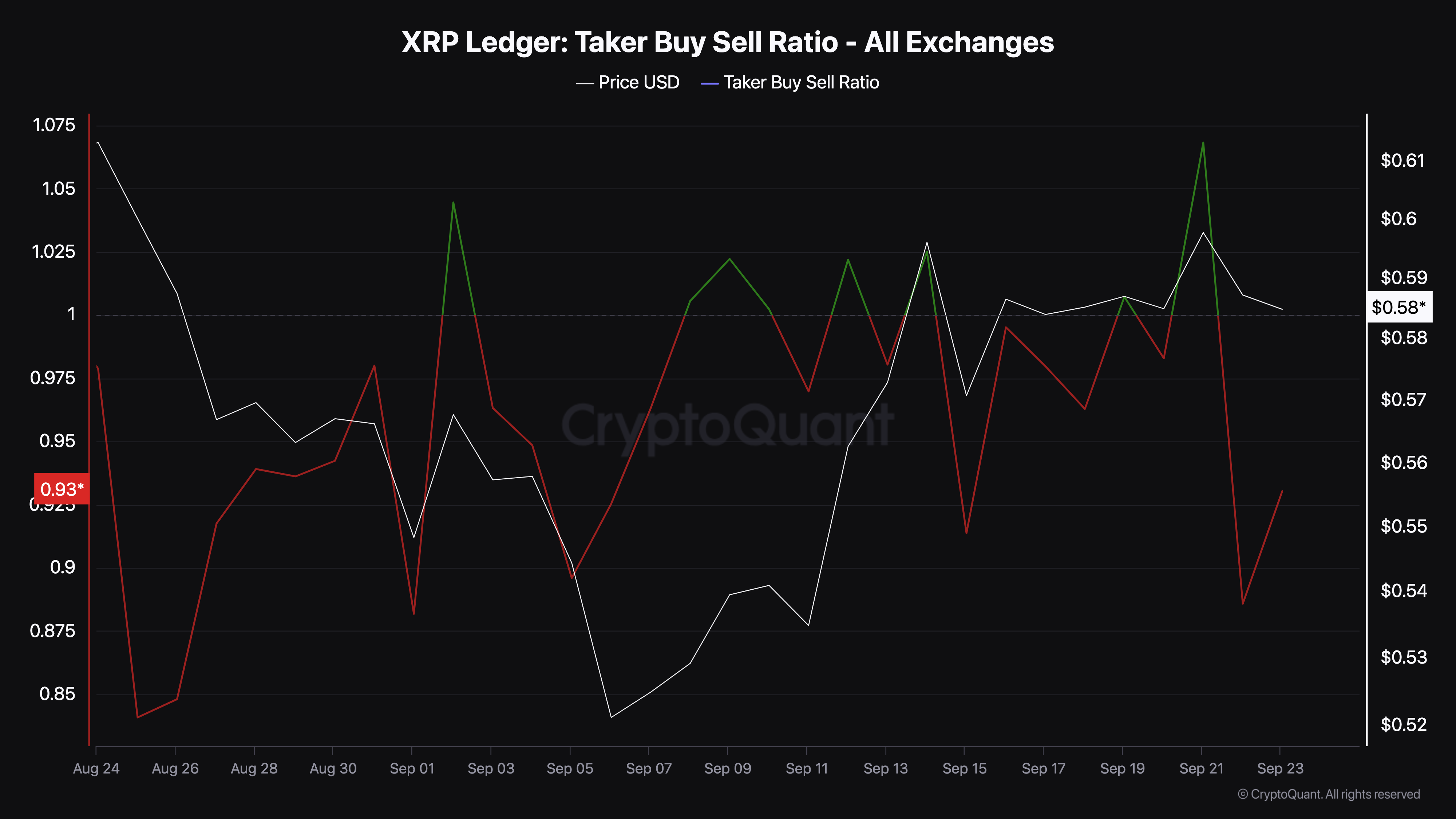 Volgens CryptoQuant steeg de Taker Buy/Sell Ratio van XRP op 21 september naar 1,06, samen met de stijging van de koers naar $0,60. De volgende dag daalde de ratio echter naar 0,88.