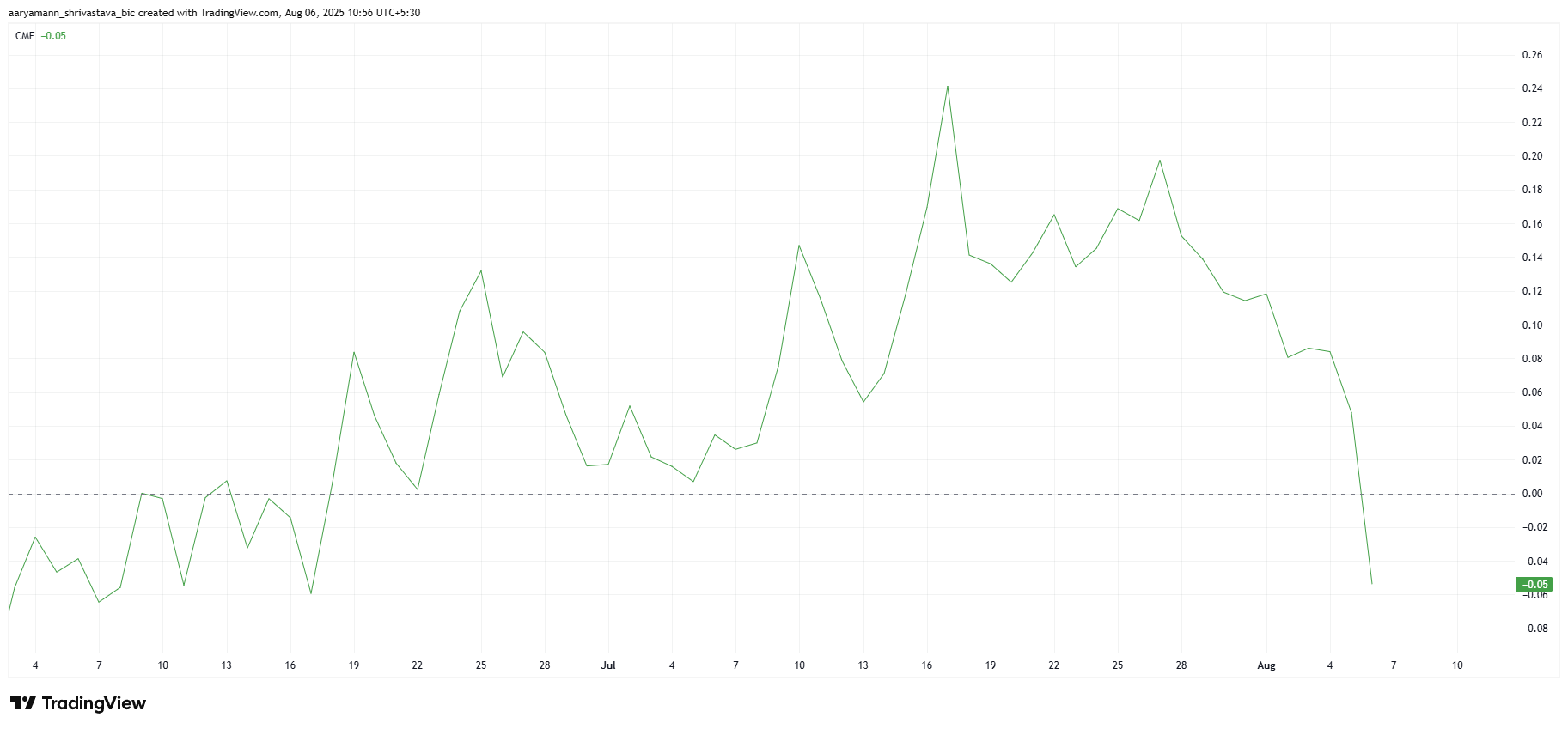 De Chaikin Money Flow (CMF) toont een scherpe daling, wat wijst op afnemend vertrouwen van investeerders en een uitstroom uit XRP. Deze daling weerspiegelt toenemende negativiteit en kan doorgaan tenzij het sentiment verandert.