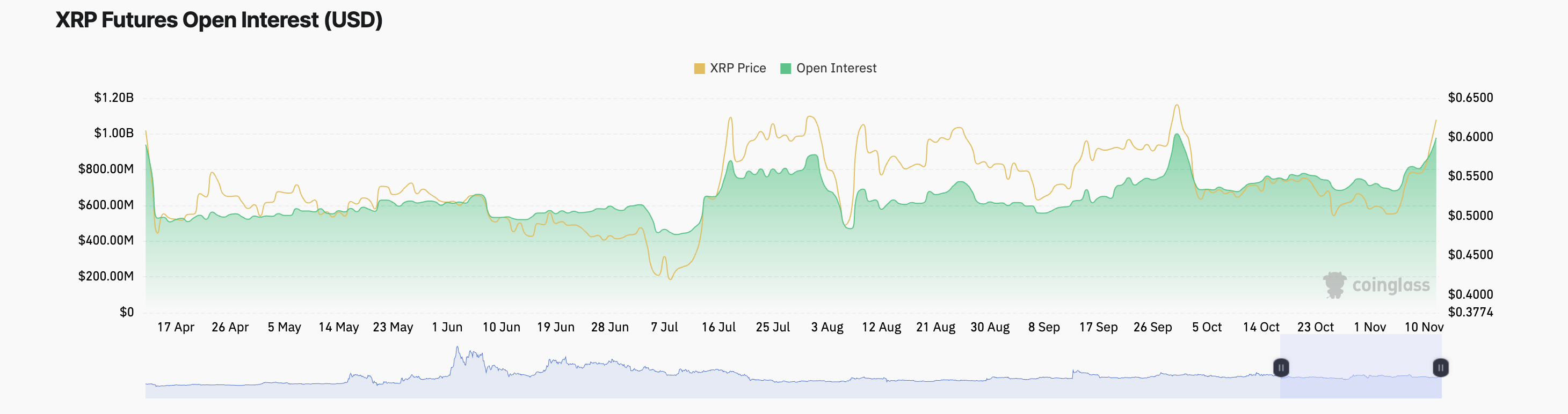 Een stijging van de open interest heeft ook de koersstijging van XRP begeleid. Op dit moment bedraagt dit $989 miljoen, een stijging van 13% in de afgelopen 24 uur.