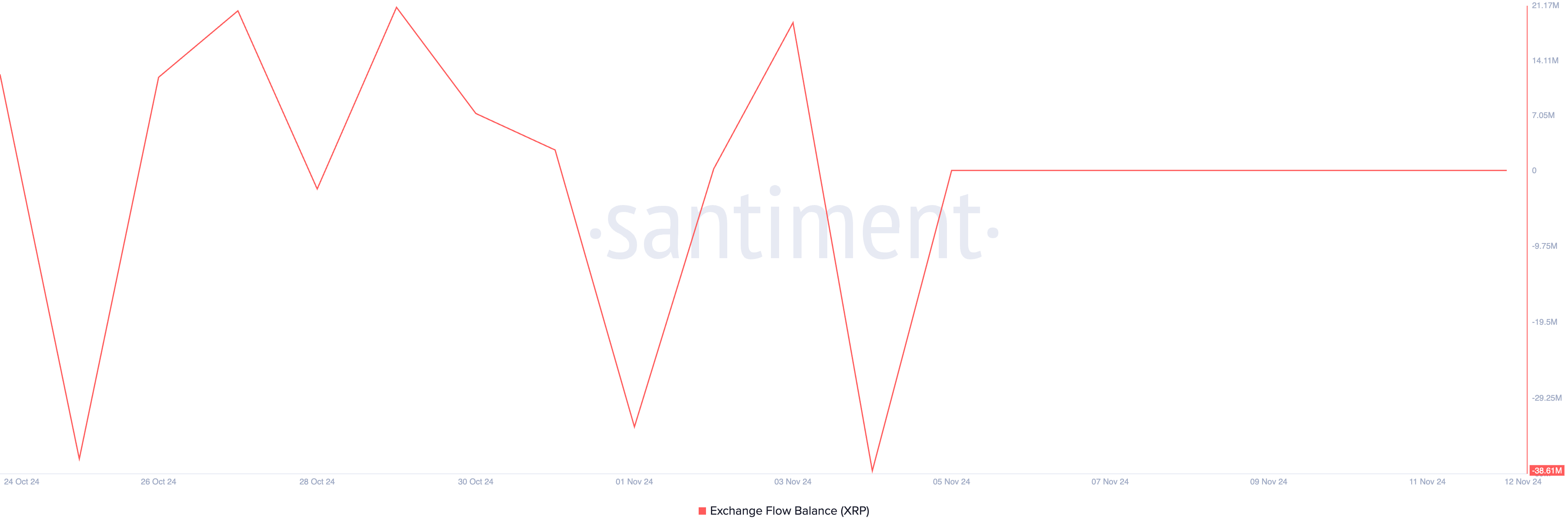 De afname van de verkoopdruk op XRP, zichtbaar in het negatieve exchange-flow volume, duidt op een voortzetting van de opwaartse trend. Een negatief exchange flow volume betekent dat meer tokens van exchanges naar wallets worden verplaatst. Uit Santiment-gegevens blijkt dat sinds dinsdag 39 miljoen XRP-tokens van exchanges zijn gehaald.