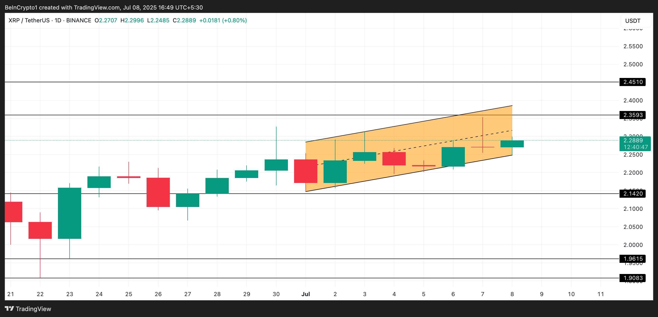 Een beslissende doorbraak onder deze onderste steunlijn wordt gezien als een bearish signaal, omdat het aangeeft dat kopers de trend niet langer kunnen vasthouden. Als dit gebeurt, loopt XRP het risico om te dalen naar $2,14.