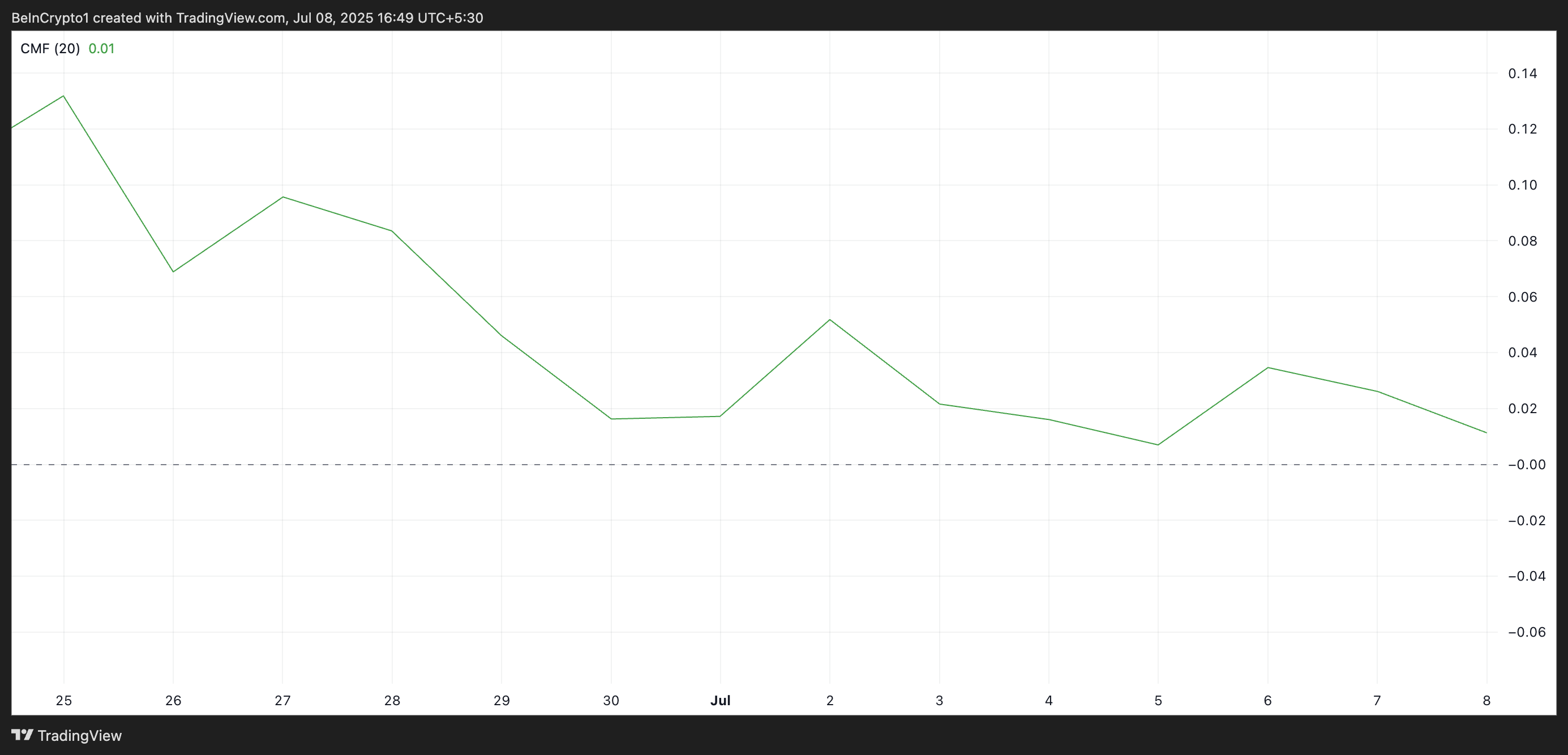 Ondanks de piek van XRP is de Chaikin Money Flow (CMF) geleidelijk gedaald, wat een negatieve divergentie vormt met de koers van de token. Op het moment van schrijven staat de indicator op 0,01 en dreigt deze onder de nulgrens te vallen.